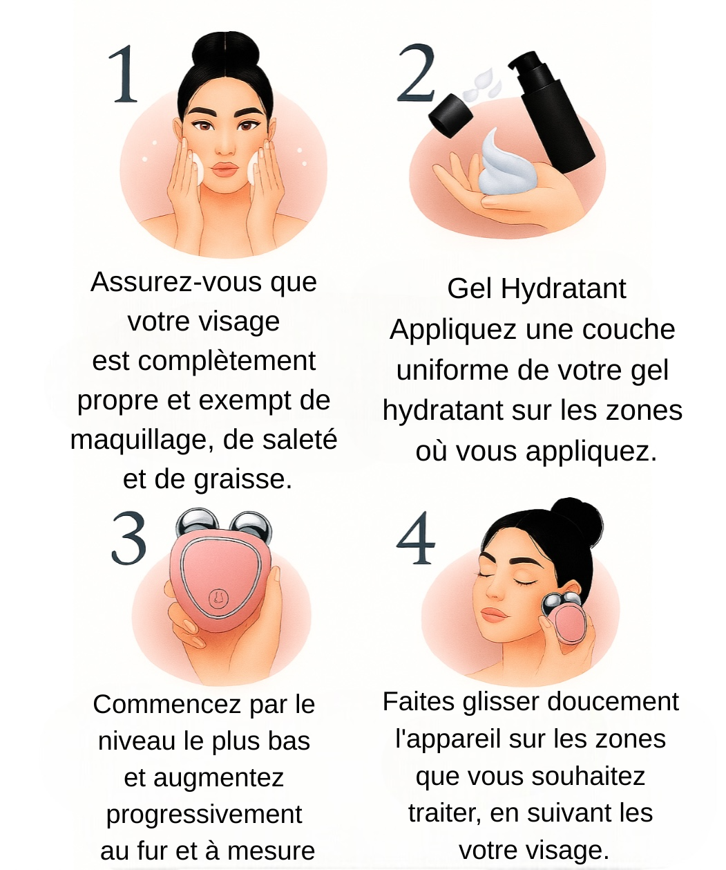 - Zones ciblées : Joues, mâchoire, front, contour des yeux